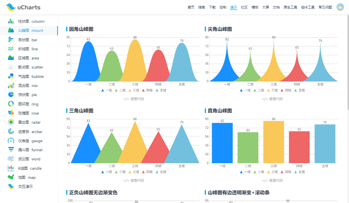 丰富图表类型 柱状图、条状图、折线图、区域图、山峰图等